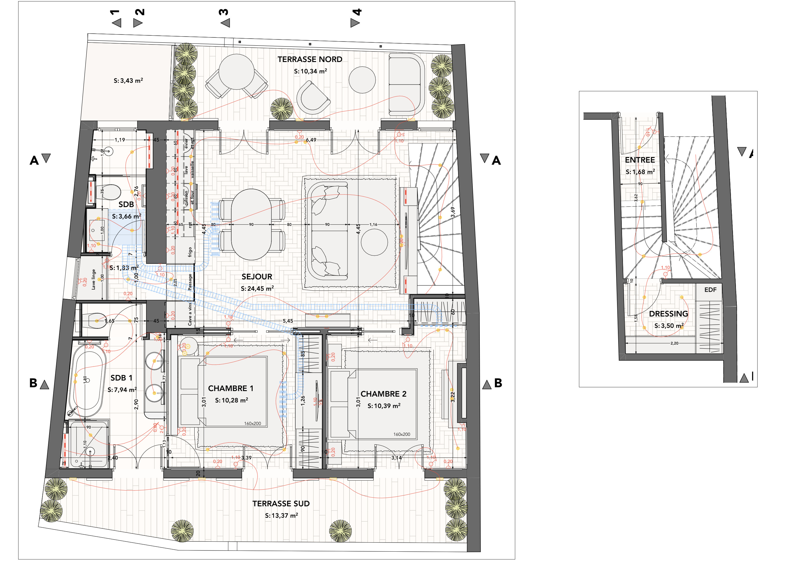 The night area offers two bedrooms, each with its own bathroom or shower room, and access to two delightful terraces, including a veranda that floods the space with light.
